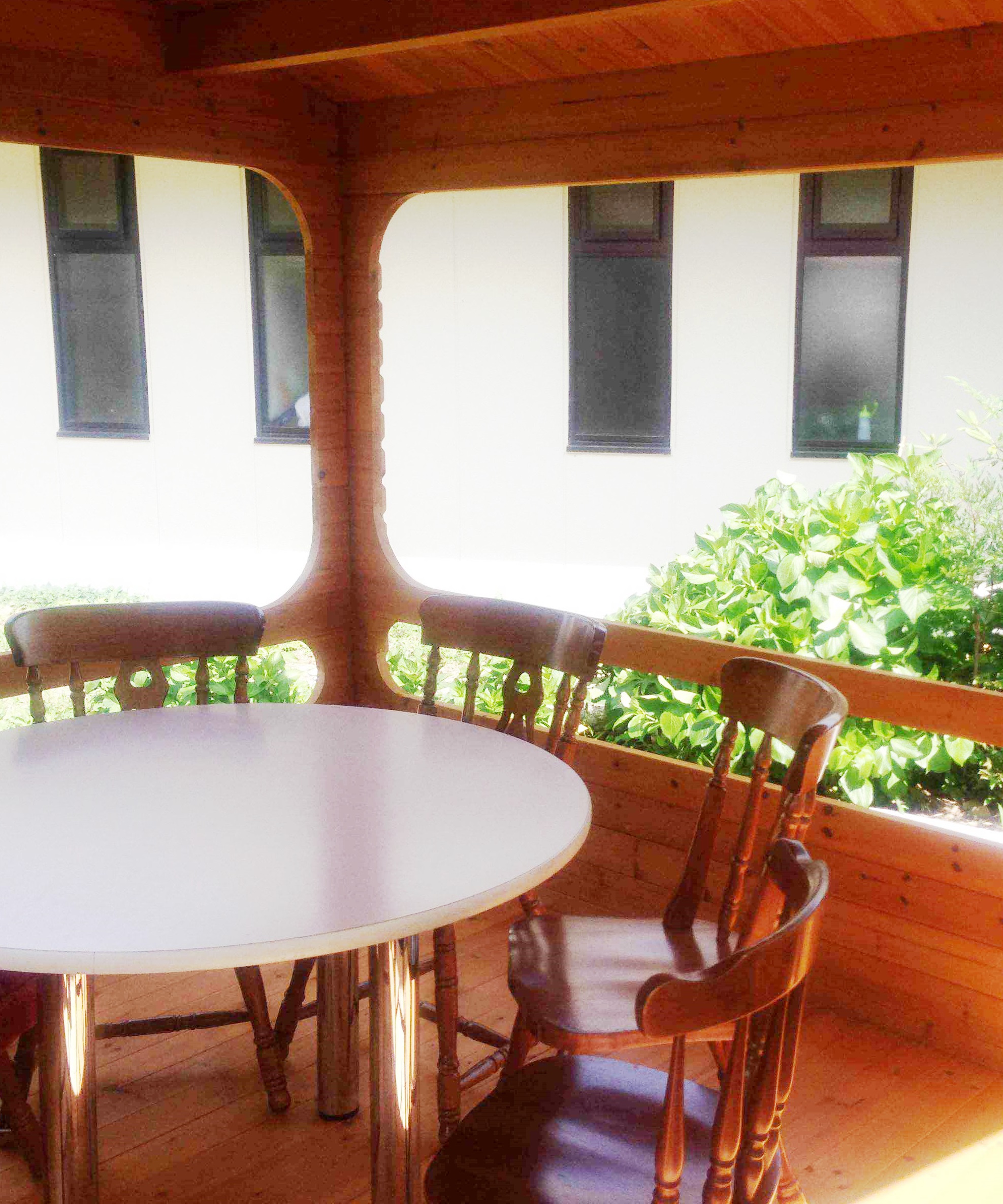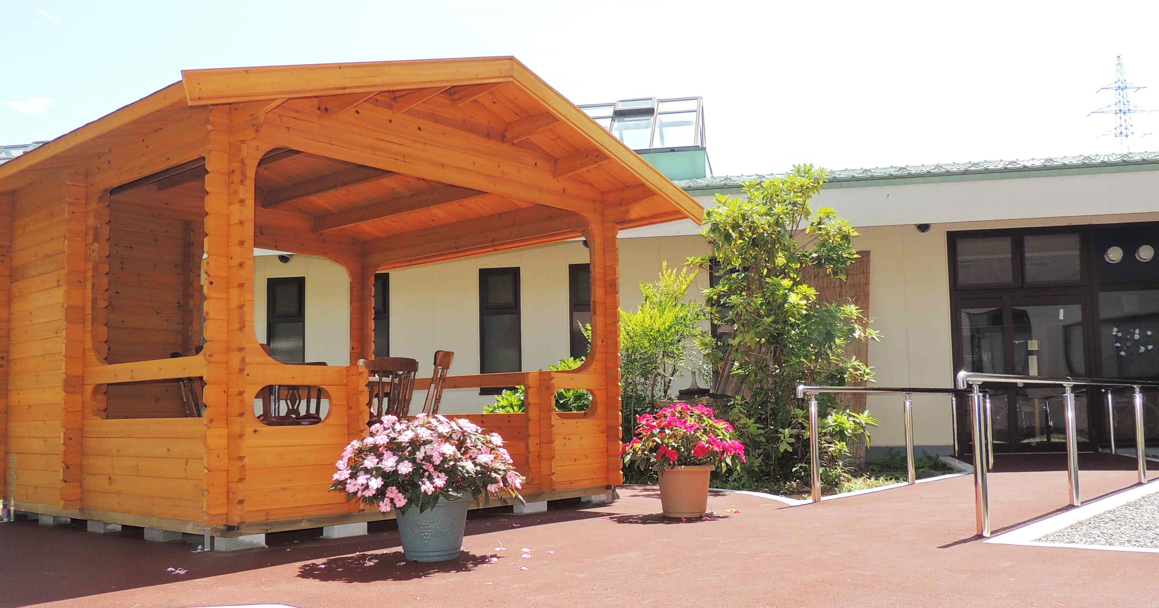 2013/08/03休憩所が完成しました。 老人保健施設中庭に、休憩所「花水木」(はなみずき)が完成いたしました。 憩いの場所として、利用者様を中心に、どなたにでもお使いいただけるようにと考えております。 ご来所の際は是非お立ち寄りください。