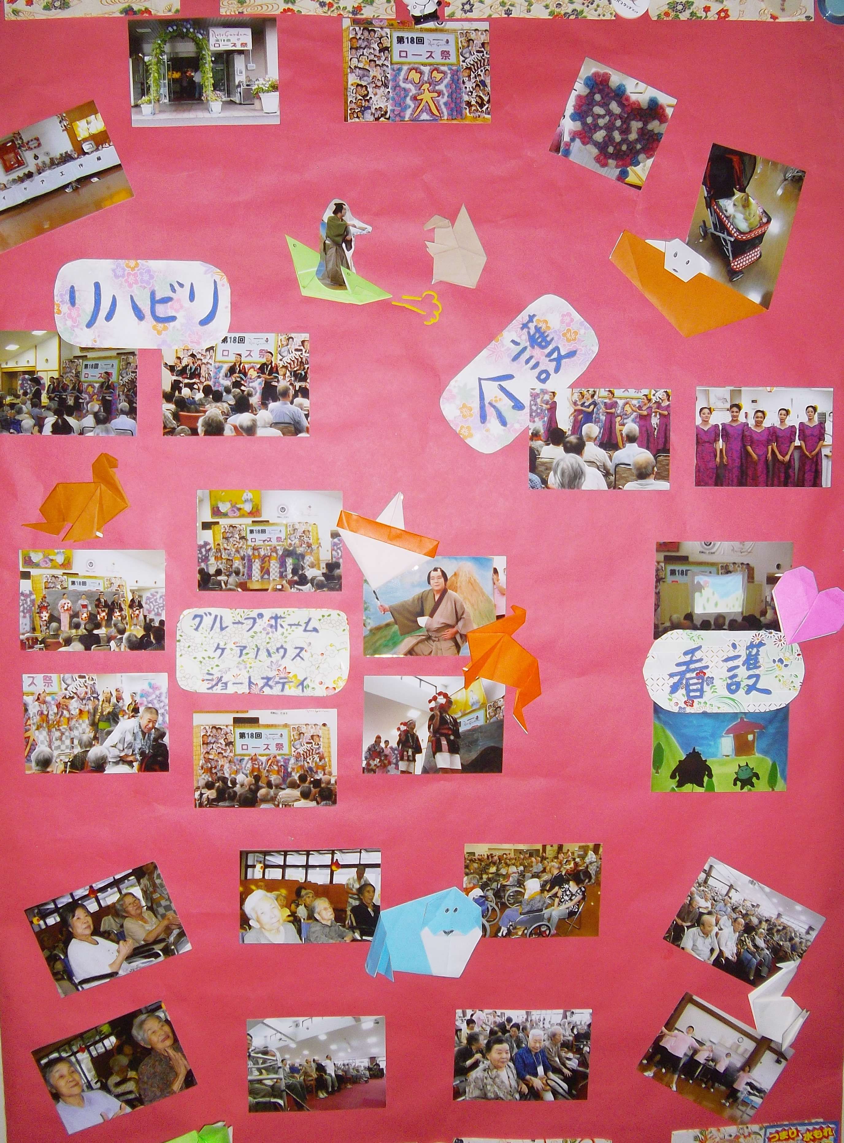 2013/09/24 第18回 ローズ祭が無事終わりました 今年のローズ祭も盛大に盛り上がりました! 各部署の職員による催しや、豪華なバイキングなど 皆様楽しんで頂けたでしょうか? 今年は利用者様のご家族や来賓の皆様も合わせて 過去最多人数のお祭りとなりました。 皆様の「笑み」がつまった写真を 老健大ホール扉の前に貼らせて頂いております。 思わず笑っちゃいますよ(^^♪ 老健リハビリ 河﨑