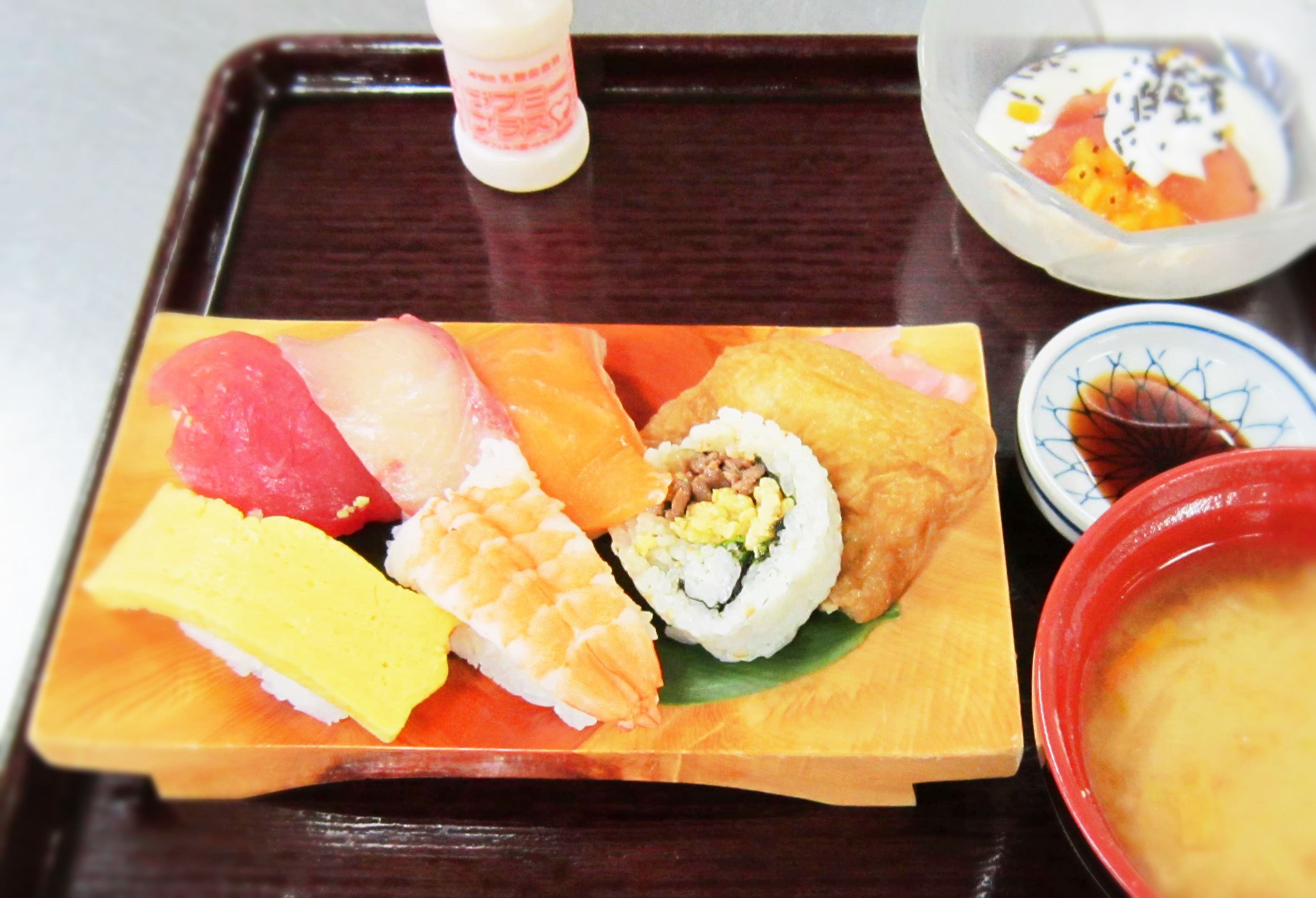 2013/12/21 寿司屋開店 11月行事食 11/19 寿司屋開店 (行事食) ・握りずし(まぐろ、かんぱち、サーモン、えび、卵焼き)・プルコギ巻き ・いなり寿司・粕汁・秋映えのコンポートヨーグルト添え 今回は久しぶりに調理場職員で、お寿司屋さんになり、皆さんの目の前で寿司を握りました。 大変好評でした。