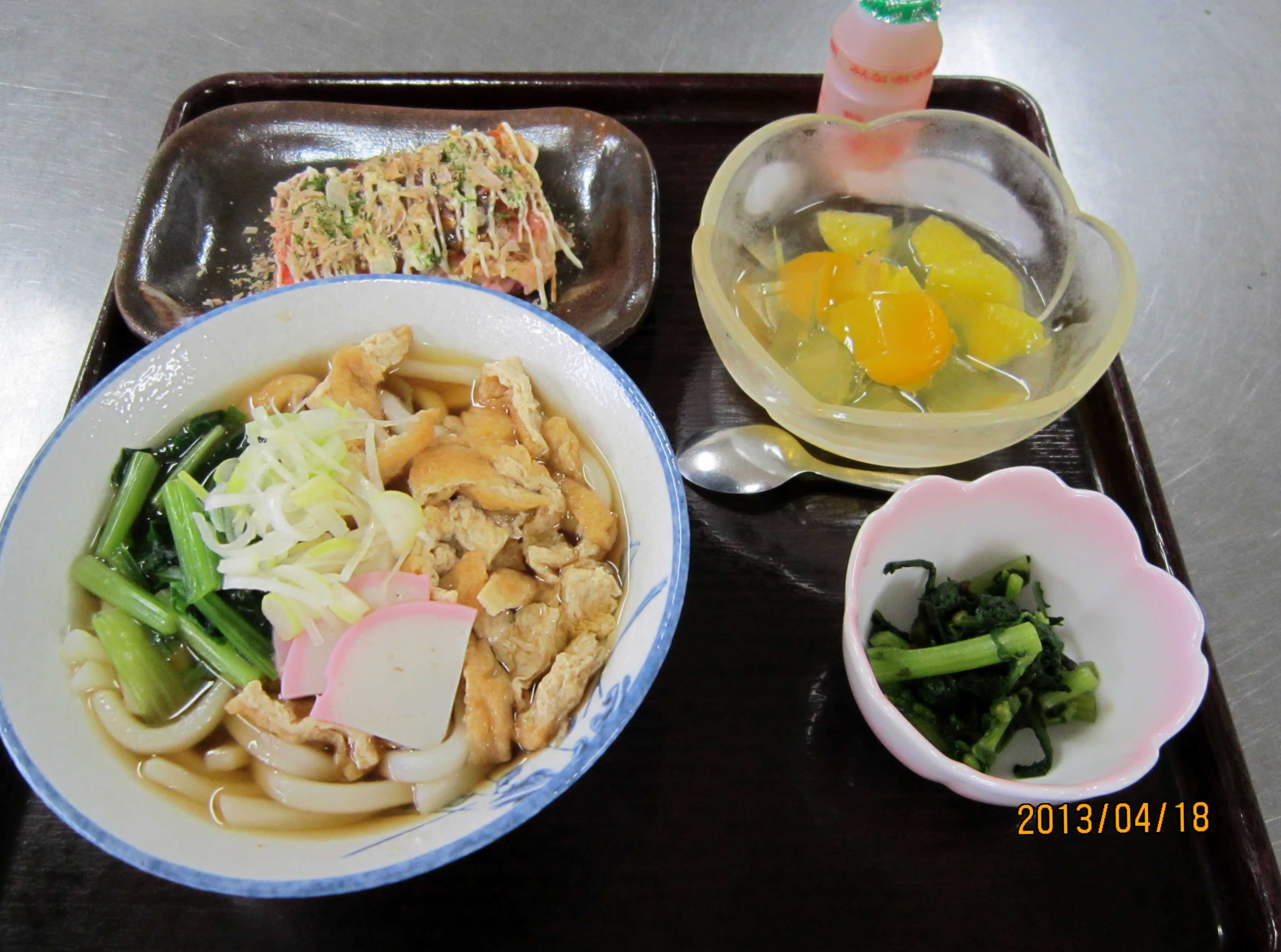 2013/05/03 4月18日は郷土食の日(大阪府) 大阪の郷土食を提供させていただきました。 ・関西風きつねうどん ・お好み焼き ・大阪春菊の塩昆布和え ・甘夏フルーツポンチ 少し甘めの揚げが好評でした。お好み焼きなど、とても喜んでいただけました。 老健厨房 原田